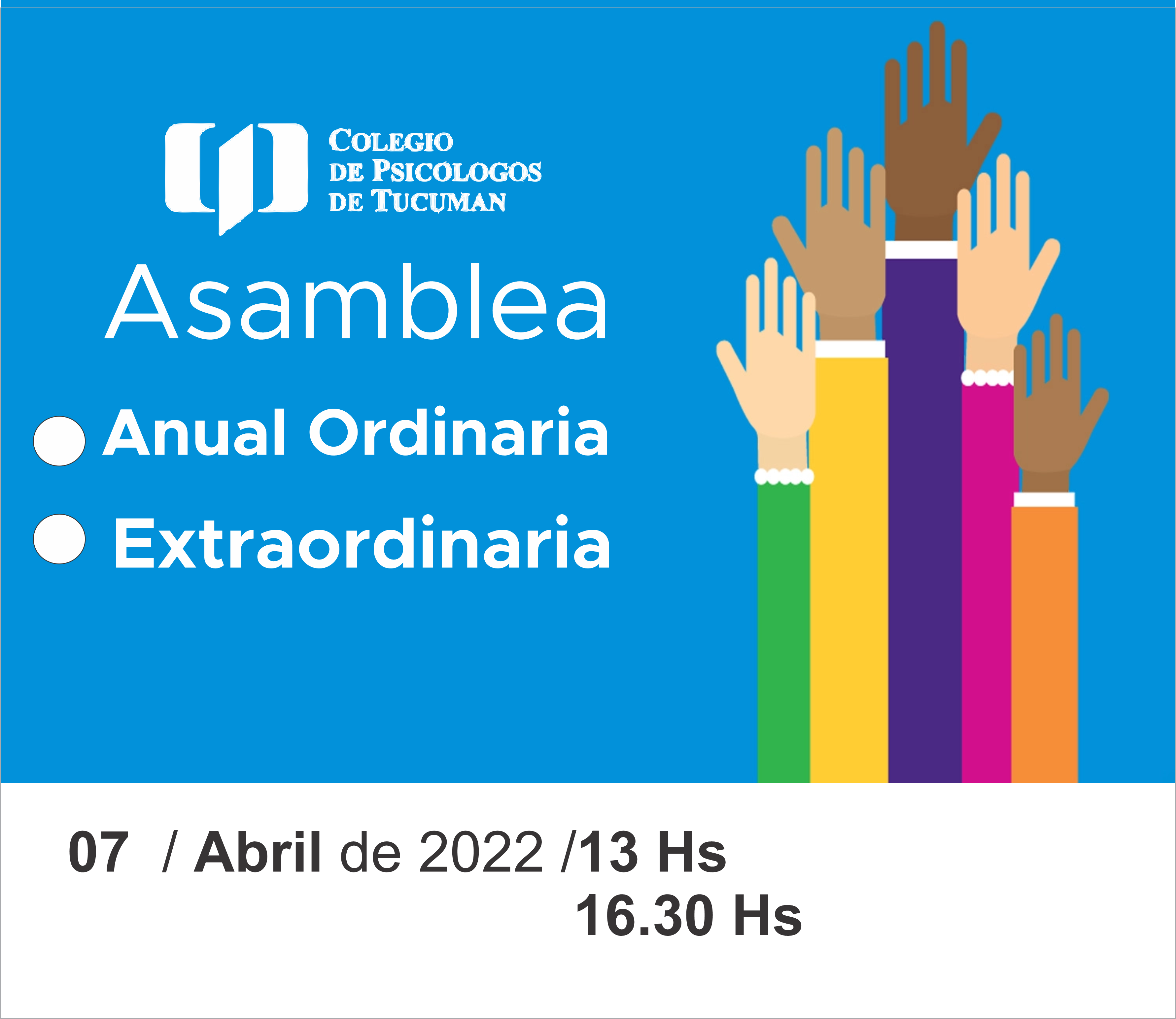 El Colegio de Psicólogos de Tucumán, convoca a la ASAMBLEA EXTRAORDINARIA para el día 07 de abril de 2022 a horas 16.30 en la Sede del Colegio, Córdoba 1027 – S. M.de Tucumán, para tratar el siguiente orden del día: 1. Elección de dos socios para la firma del Acta. 2. Modificación parcial del Reglamento o del Subsidio de Incapacidad Transitoria (SIT).