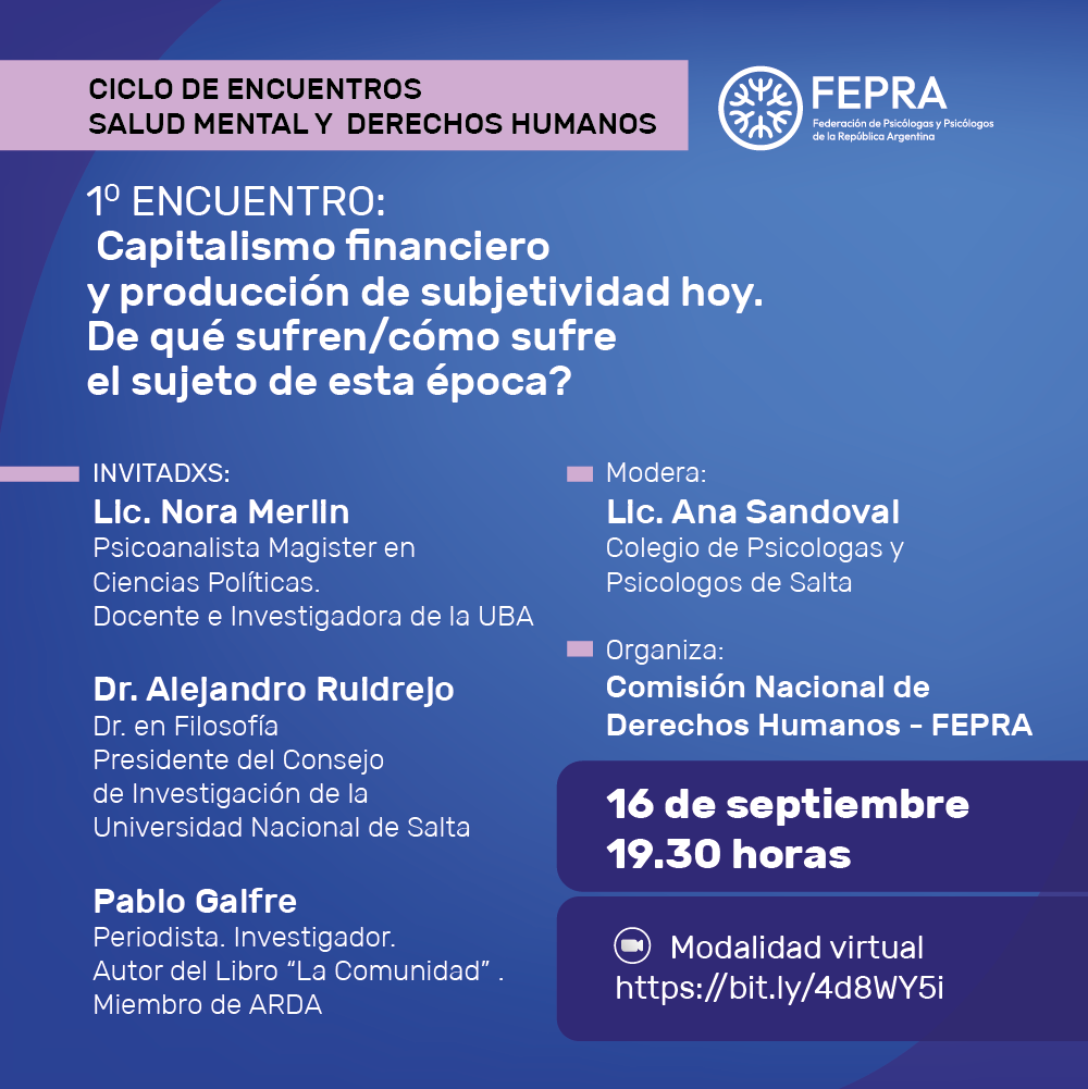 La Comisión Nacional de Derechos Humanos, la/os invitan al Ciclo de Encuentros Salud mental y Derechos Humanos – 1º Encuentro: «Capitalismo financiero y producción de subjetividad hoy. De qué sufren/ cómo sufre el sujeto de esta época?» a realizarse el día lunes 16 de Septiembre a las 19.30 hs, modalidad virtual (plataforma zoom).