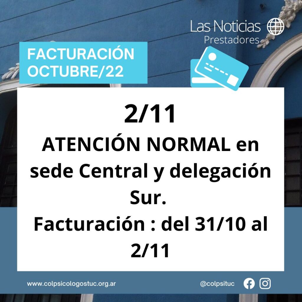 Facturación Octubre/22 Nov 1, 2022 | Noticias, Obras Sociales Atención Normal en sede central y delegación sur. La recepción de facturación se realizará del 31/10 al 02/11.