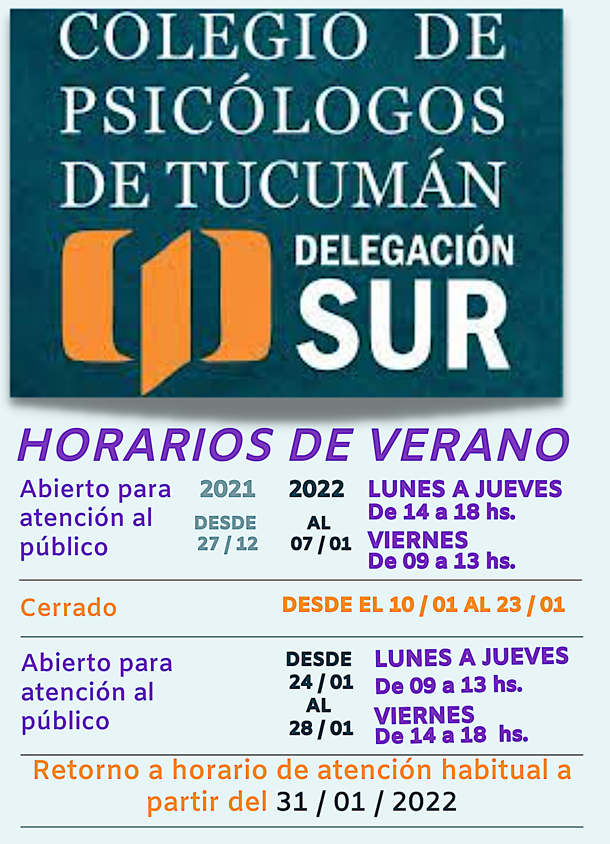 Desde el 24 al 28 de enero de 2022 la delegación permanecerá abierta para la atención al público de lunes a jueves de 9.00 a 13.00 hs. y viernes de 14.00 a 18.00 hs.