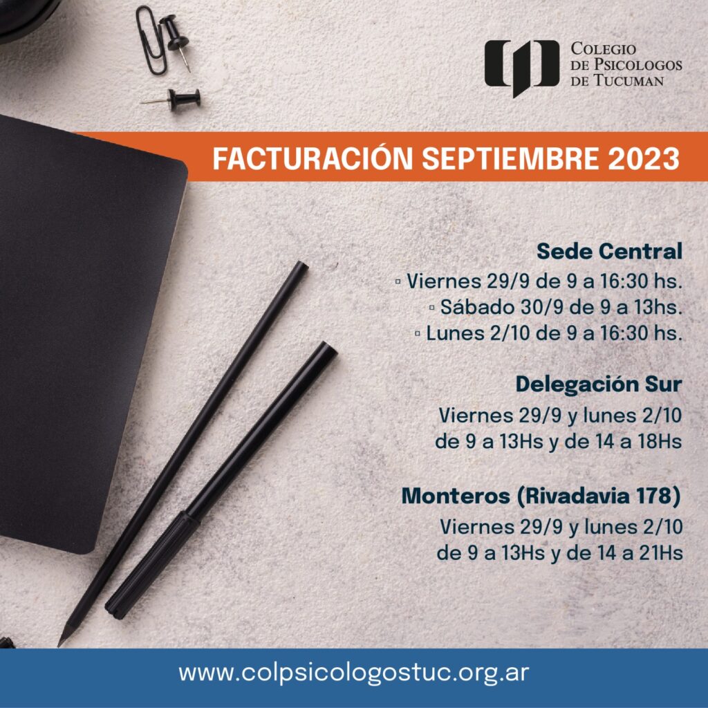 Importante, les recordamos las fechas y horarios habilitados para presentar la facturación de septiembre Sep 26, 2023 | Noticias Sede CentralViernes 29/9 de 9 a 16:30 hs.Sábado 30/9 de 9 a 13hs.Lunes 2/10 de 9 a 16:30 hs.Delegación SurViernes 29/9 y lunes 2/10 de 9 a 13Hs y de 14 a 18HsMonteros (Rivadavia 178)Viernes 29/9 y lunes 2/10 de 9 a 13Hs y de 14 a 21Hs
