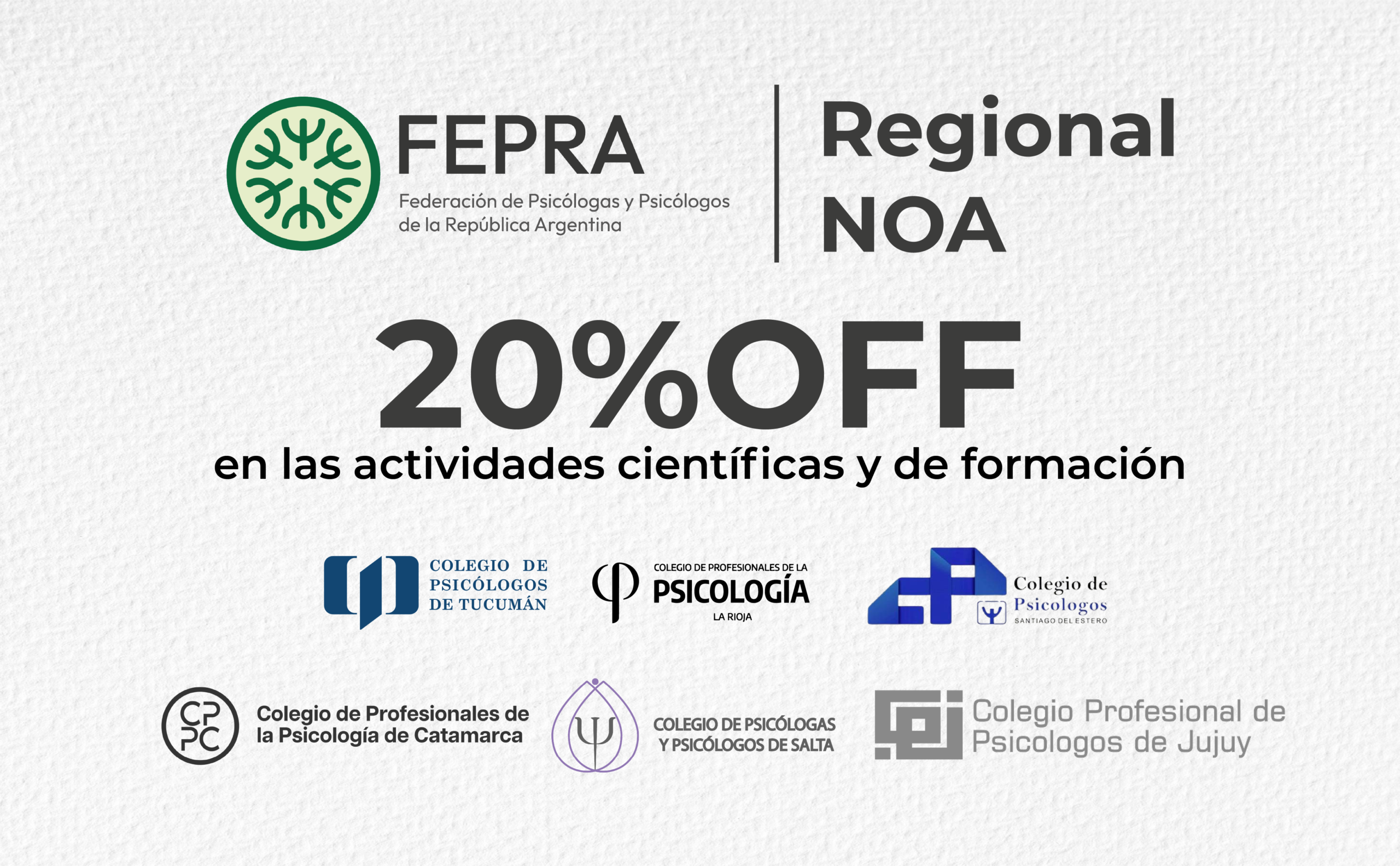 En el marco del Convenio Institucional suscripto por los Colegios que integran la Regional NOA —el Colegio de Psicólogas y Psicólogos de Salta, el Colegio de Psicólogos de Catamarca, el Colegio de Psicólogos de Jujuy, el Colegio de Psicólogos de La Rioja, el Colegio de Psicólogos de Santiago del Estero y el Colegio de Psicólogos de Tucumán— se establece que las y los matriculados activos de cada institución cuentan con un 20% de descuento en las actividades científicas y de formación organizadas íntegramente por los Colegios firmantes.