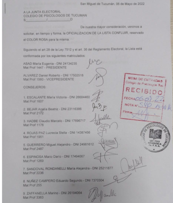 SIGUIENDO EL ARTÍCULO 28 DE LA LEY 7512 Y EL ART 36 DEL REGLAMENTO ELECTORAL LAS LISTAS ESTAN CONFORMADAS DE LA SIGUIENTE MANERA: