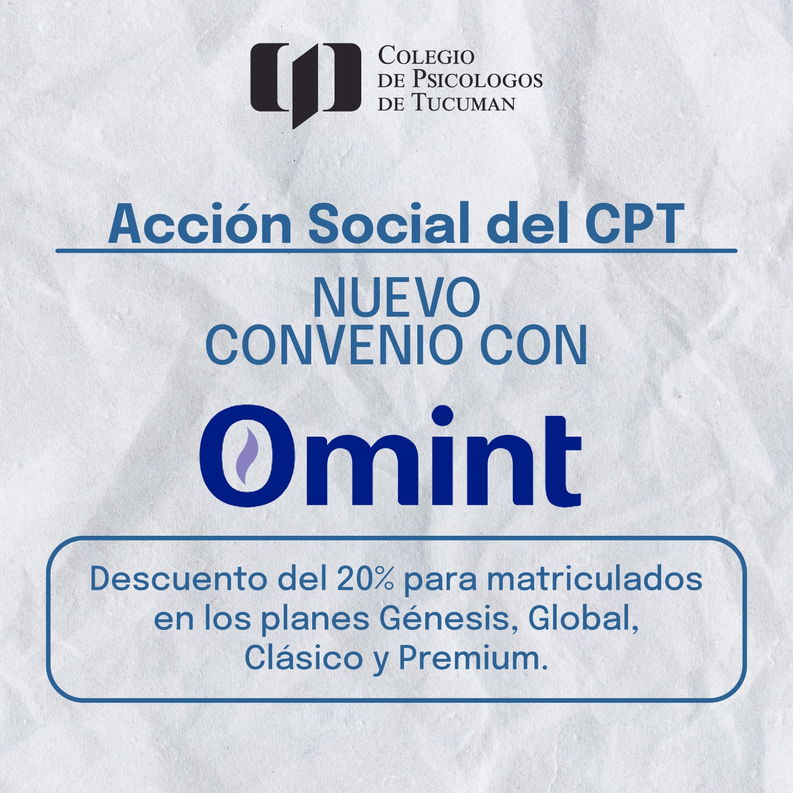 Informamos a los asociados sobre el nuevo convenio con OMINT por el que los matriculados podrán acceder al 20% de descuento en los planes Génesis, Global, Clásico y Premium.