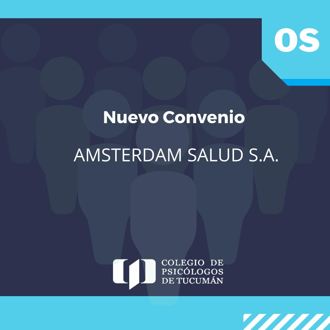 El Colegio de Psicólogos de Tucumán firmó un nuevo convenio prestacional con Amsterdam Salud S.A. Para conocer los detalles, siga el enlace https://colpsicologostuc.org.ar/obras-sociales/ en la pestaña Amstedam Salud. Celebramos la incorporación de la prestadora y renovamos el compromiso de ampliar nuestros servicios en la provincia.