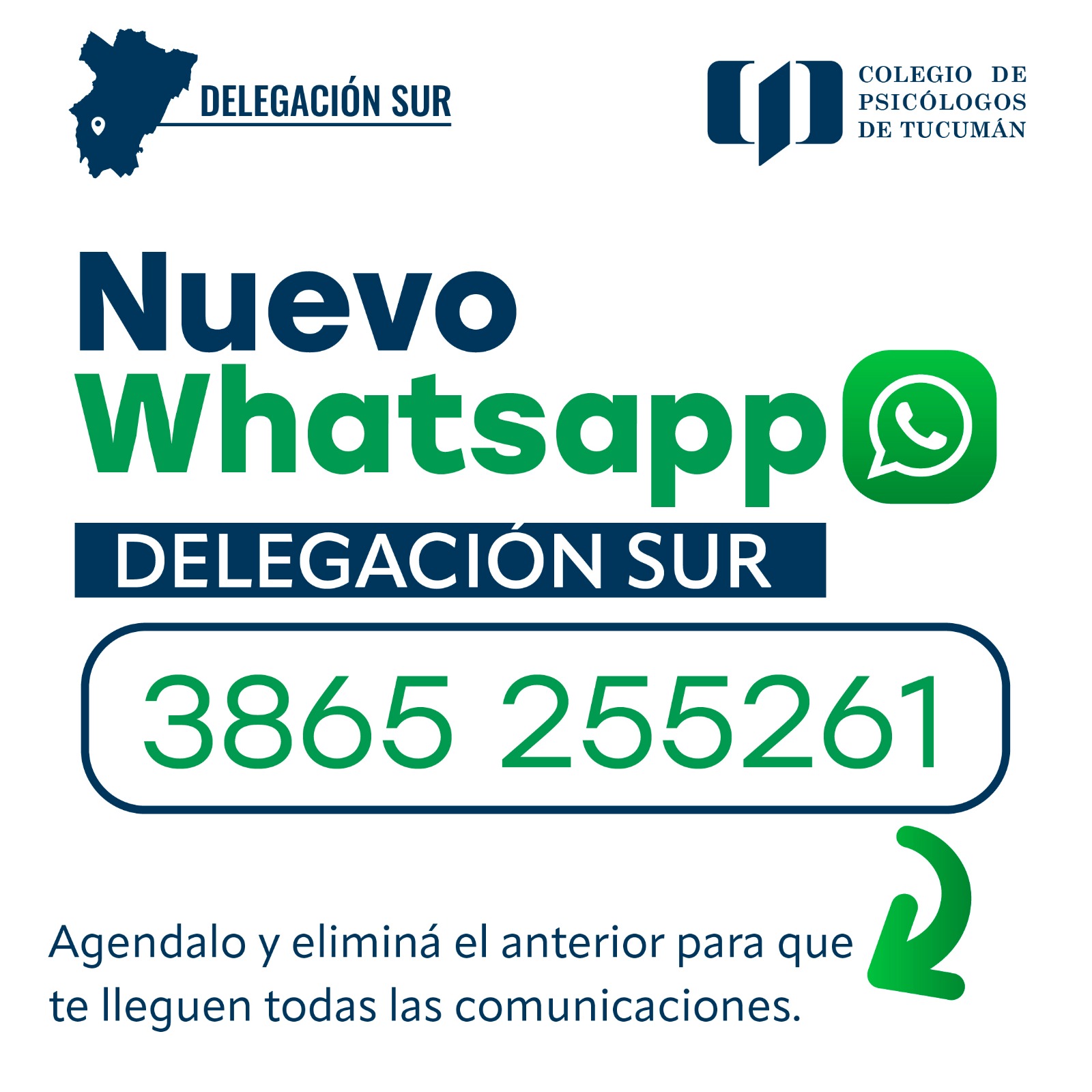 Nuevo número de WhatsApp en Delegación Sur Sep 16, 2024 | Noticias DELEGACIÓN SUR Atención! La Delegación Sur cuenta con un nuevo número de WhatsApp, el anterior dejó de estar en funcionamiento, elimínalo y agendá el nuevo para que te llegue toda la información. Nuevo número 3865255261