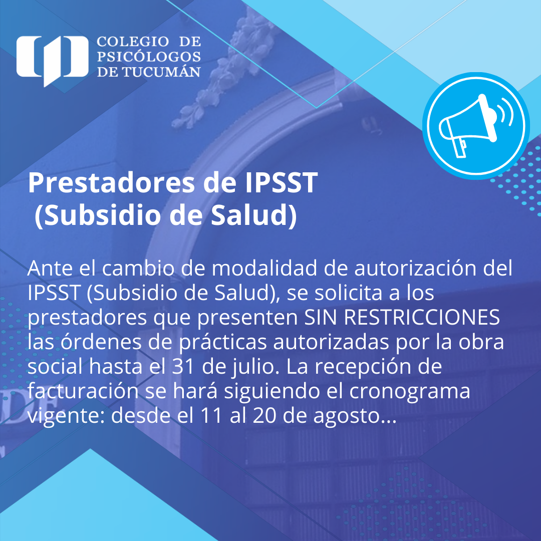 Ante el cambio de modalidad de autorización del IPSST (Subsidio de Salud), se solicita a los prestadores que presenten SIN RESTRICCIONES las órdenes de prácticas autorizadas por la obra social hasta el 31 de julio. La recepción de facturación se hará siguiendo el cronograma vigente: desde el 11 al 20 de agosto