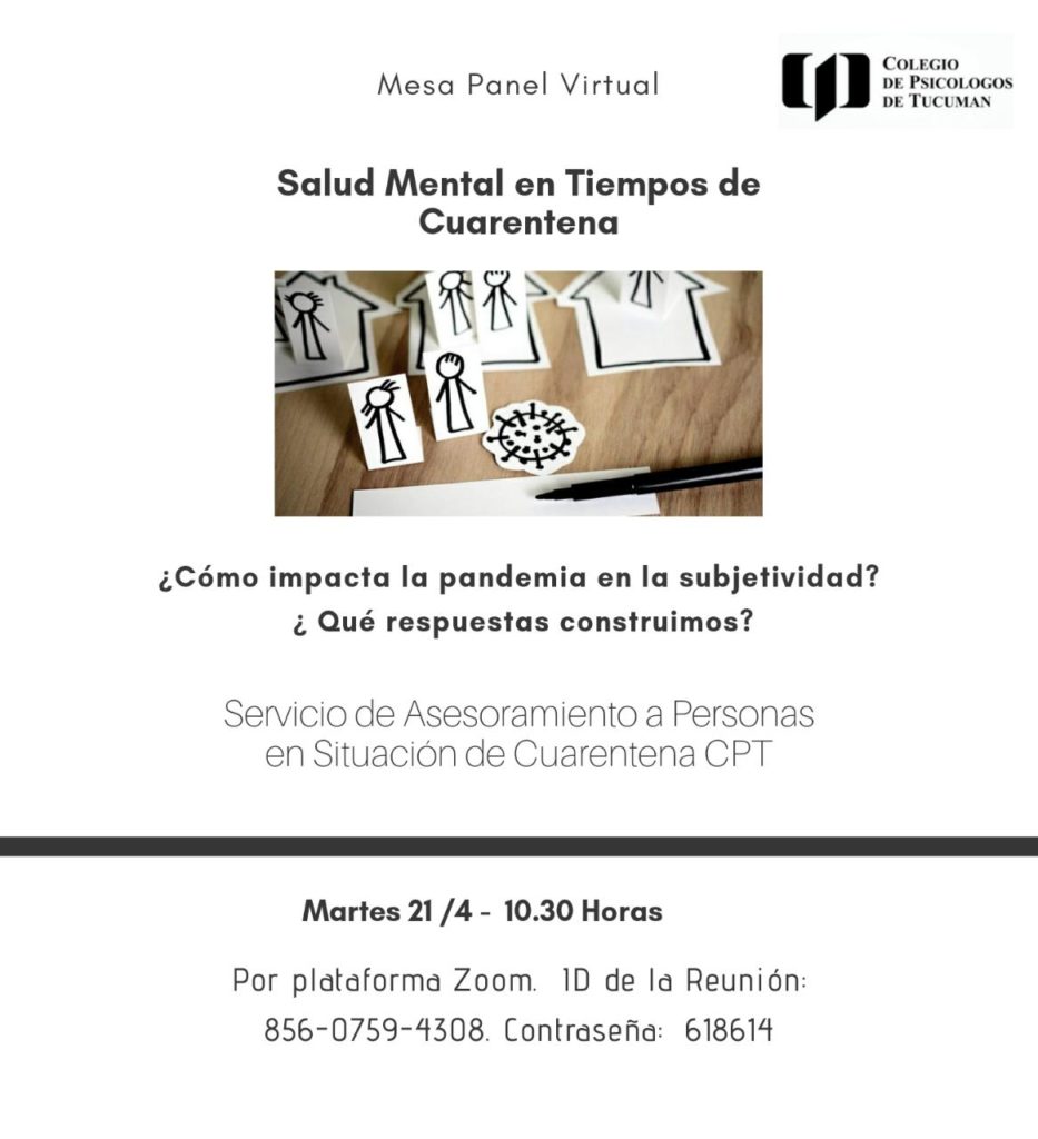 El «Servicio de Asesoramiento Psicológico a personas en situación de Cuarentena» ofrecerá una mesa panel abierta a la comunidad sobre «Salud Mental en tiempos de Cuarentena». Allí los Voluntarios responsables del Servicio explicarán el tipo de consultas que reciben, las formas de intervención, y las recomendaciones posibles para proteger nuestra salud mental y organizarnos frente a la pandemia covid19..