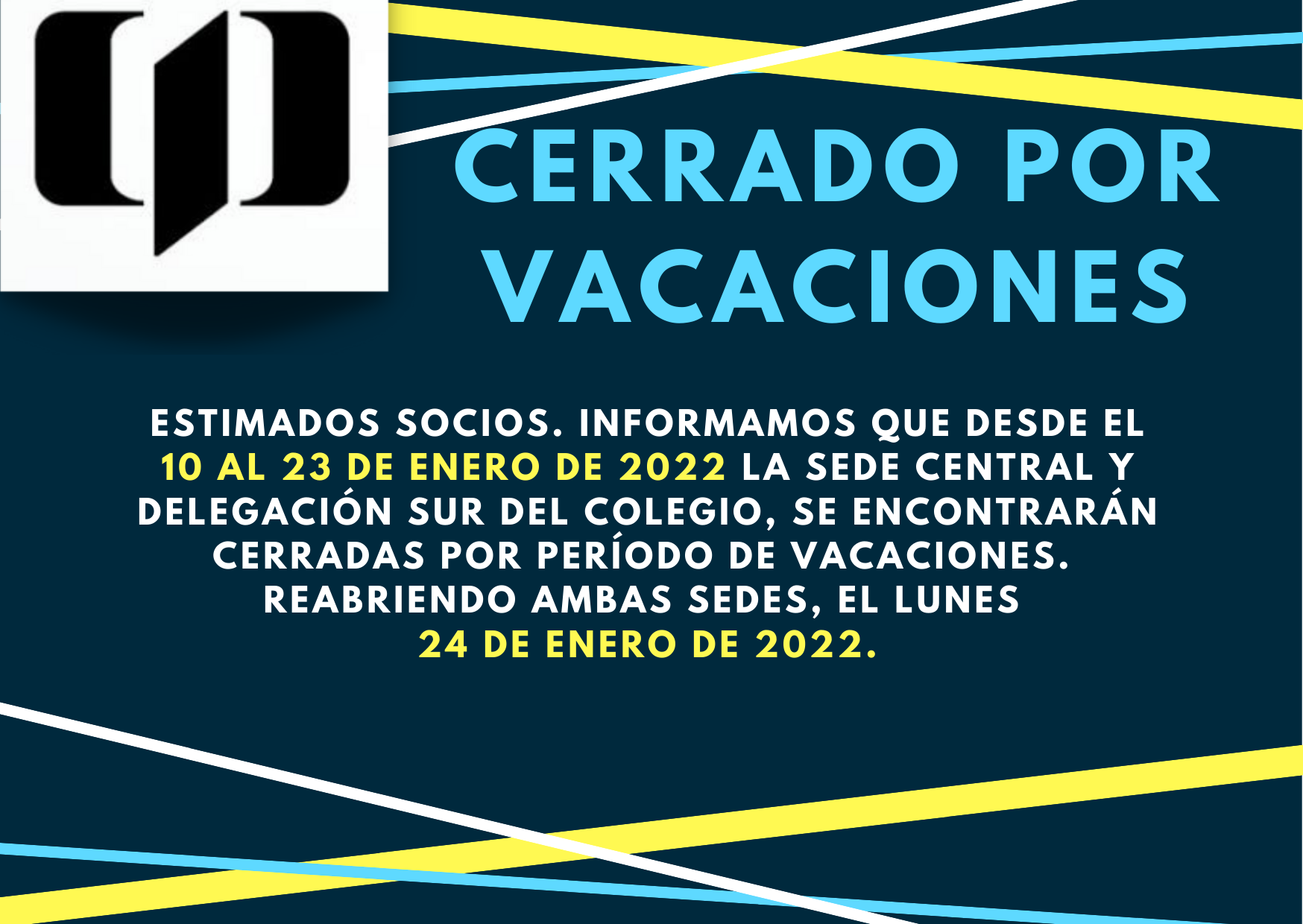 Sede Central y Delegación Sur cerrado hasta el 24 de enero Dic 28, 2021 | Noticias Estimados asociados, informamos que desde el 10 al 23 de Enero de 2022 la Sede Central y la Delegación Sur del Colegio, permanecerán cerradas por período de vacaciones. Reabriremos ambas sedes, el lunes 24 de Enero de 2022. Muchas gracias por acompañarnos. CD-CPT.